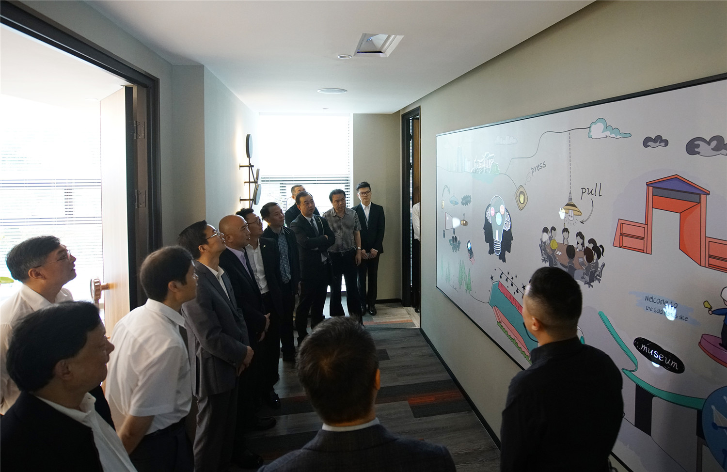 領(lǐng)導(dǎo)一行先后參觀了蘇州金螳螂文化發(fā)展股份有限公司公司各部門辦公環(huán)境及文化創(chuàng)意展廳,并在多媒體實(shí)驗(yàn)室觀看了數(shù)字影片,對公司設(shè)計(jì)、創(chuàng)意、藝術(shù)為一體的創(chuàng)意展示能力和技術(shù)應(yīng)用水平深表贊賞。