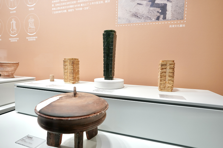 展廳內,三個展柜依次展示了草鞋山遺址出土的代表性文物。外方內圓,上下通透,表面有紋飾,通過全息投影方式呈現的“中華第一玉琮”,它的出土打破了人們對玉琮年代的原有普遍認知。