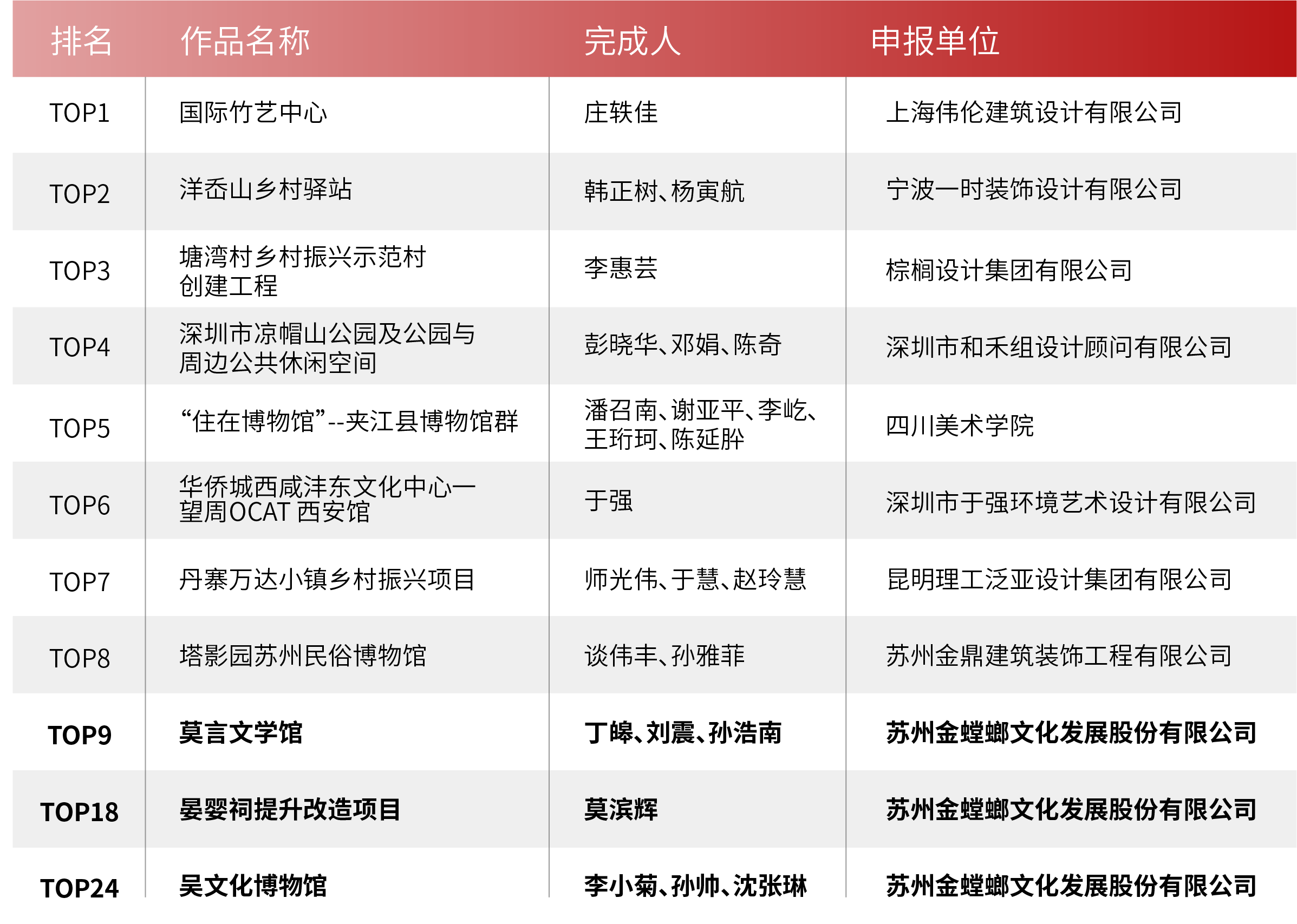 2022年鄉(xiāng)村公共文化空間 設(shè)計展示活動 終評結(jié)果于近日公布 金螳螂文化再創(chuàng)佳績 獲評 最佳設(shè)計/運營機(jī)構(gòu) 3 個項目獲得 最美鄉(xiāng)村公共文化空間 (空間設(shè)計類) 為深入貫徹落實習(xí)近平總書記關(guān)于文化和旅游工作重要論述精神,持續(xù)發(fā)現(xiàn)和推出一批“美”“好”“新”的鄉(xiāng)村公共文化空間,引領(lǐng)新時代鄉(xiāng)村公共文化空間構(gòu)建,推動鄉(xiāng)村公共文化服務(wù)高質(zhì)量發(fā)展,助力鄉(xiāng)村振興。 文化和旅游部全國公共文化發(fā)展中心聯(lián)合中國群眾文化學(xué)會、中國建筑裝飾協(xié)會、成都市人民政府、新華網(wǎng)聯(lián)合主辦了2022年鄉(xiāng)村公共文化空間設(shè)計展示活動。 經(jīng)組織專家組進(jìn)行獨立評審,按照公開、公平、公正原則,研究形成最美鄉(xiāng)村公共文化空間(創(chuàng)新案例類)TOP30,最美鄉(xiāng)村公共文化空間(空間設(shè)計類)TOP30,網(wǎng)絡(luò)人氣項目TOP10,最佳設(shè)計/運營機(jī)構(gòu)TOP10,優(yōu)秀組織單位等名單。 以“我是一個講故事的人”為設(shè)計理念,依托紙張的藝術(shù)表現(xiàn)形式,用喚起感官聯(lián)覺的創(chuàng)新展陳形態(tài),將莫言的文學(xué)內(nèi)涵轉(zhuǎn)化為具象的藝術(shù)展示。 充分利用中庭中空的建筑特點,依托莫言的文學(xué)特性,引入時間與光影的語言,日光傾瀉帶來無限希望和遐想,就像莫言的文學(xué)作品,用文字突破時空形成的經(jīng)緯限制。 晏嬰祠項目地點位于山東德州齊河縣,是為紀(jì)念春秋時期齊相晏嬰而建的一座仿漢制殿宇式宗廟性建筑,旨在通過宣揚晏嬰廉潔、勤勉、愛民、仁政的政治主張,是集教育、學(xué)習(xí)、交流于一體的德政文化教育基地。 晏嬰祠占地面積約30畝,建筑面積3000多平方米,建筑造型奇特,雄偉壯觀。設(shè)計區(qū)域面積分為室內(nèi)880平方,庭院連廊1200平方。展示主題以祭祀為中心功能,以晏嬰故事為重點,彰顯晏嬰的品質(zhì)和功績,突出歷史評價及對當(dāng)今德政教育的意義。 蘇州市吳中區(qū)博物館,又名吳文化博物館,位于蘇州市吳中區(qū)澹臺街9號。博物館占地面積8500平方米,擁有6800件吳地珍貴文物。 金螳螂文化的設(shè)計團(tuán)隊以“人文吳中,美麗太湖,詩意江南”為線索,通過靈活多變的闡釋體系,清新雅致的空間氛圍,富于創(chuàng)造性的表現(xiàn)手法,對吳文化的演變脈絡(luò)、風(fēng)雅內(nèi)涵,以及吳地的美麗風(fēng)物、雅頌傳承進(jìn)行系統(tǒng)而深刻的展示。 金螳螂文化成立于2001年,是國家高新技術(shù)企業(yè),在北京、上海、南京、西安、重慶等地均設(shè)有分支機(jī)構(gòu)。 公司以策劃設(shè)計創(chuàng)意為核心,科技、文化、藝術(shù)跨界融合,為各類客戶提供空間環(huán)境藝術(shù)策劃,創(chuàng)意設(shè)計、開發(fā)、布展整體解決方案,形成了以博物館、科技館,城市主題文化館、美術(shù)館、企業(yè)文化館、文旅景區(qū)、歷史街區(qū)、特色小鎮(zhèn)等為主要內(nèi)容的業(yè)務(wù)體系。 △ 金螳螂文化總部大廈設(shè)計效果圖,預(yù)計2024年建成 從江南水鄉(xiāng)到三秦大地,金螳螂文化詮釋空間故事,打造了數(shù)十個全國及各省市重點文化項目,收獲了眾多設(shè)計、施工類獎項,得到了業(yè)主認(rèn)可,塑造了“創(chuàng)新質(zhì)造”的行業(yè)口碑。