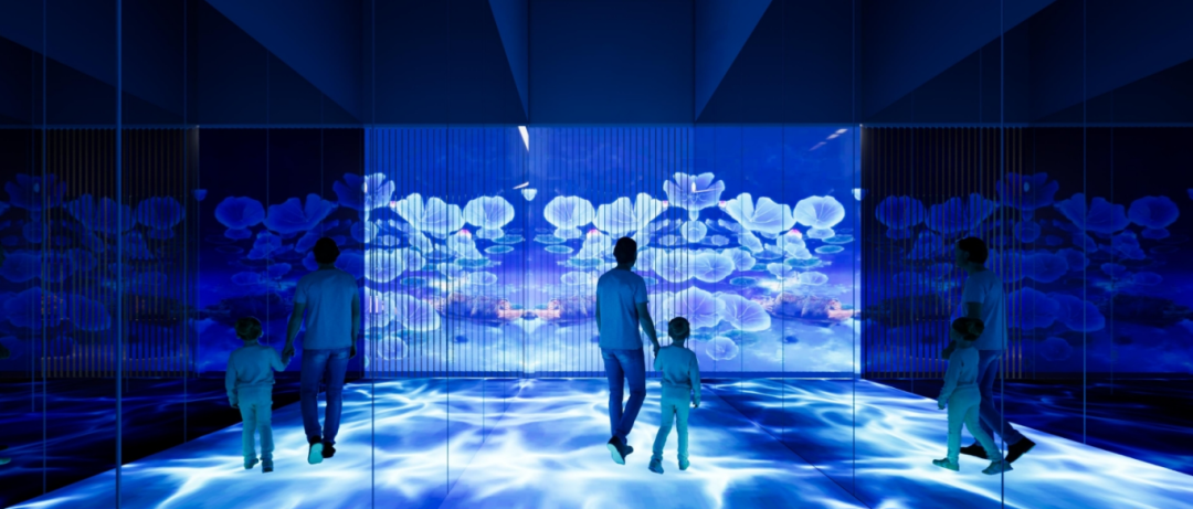 走廊地面巧妙運用“數字藝術”營造出了江海河邊界,輔以兩側的鏡面玻璃,整個空間呈現出江蘇省江河湖海的廣闊地理視野和水韻風貌。